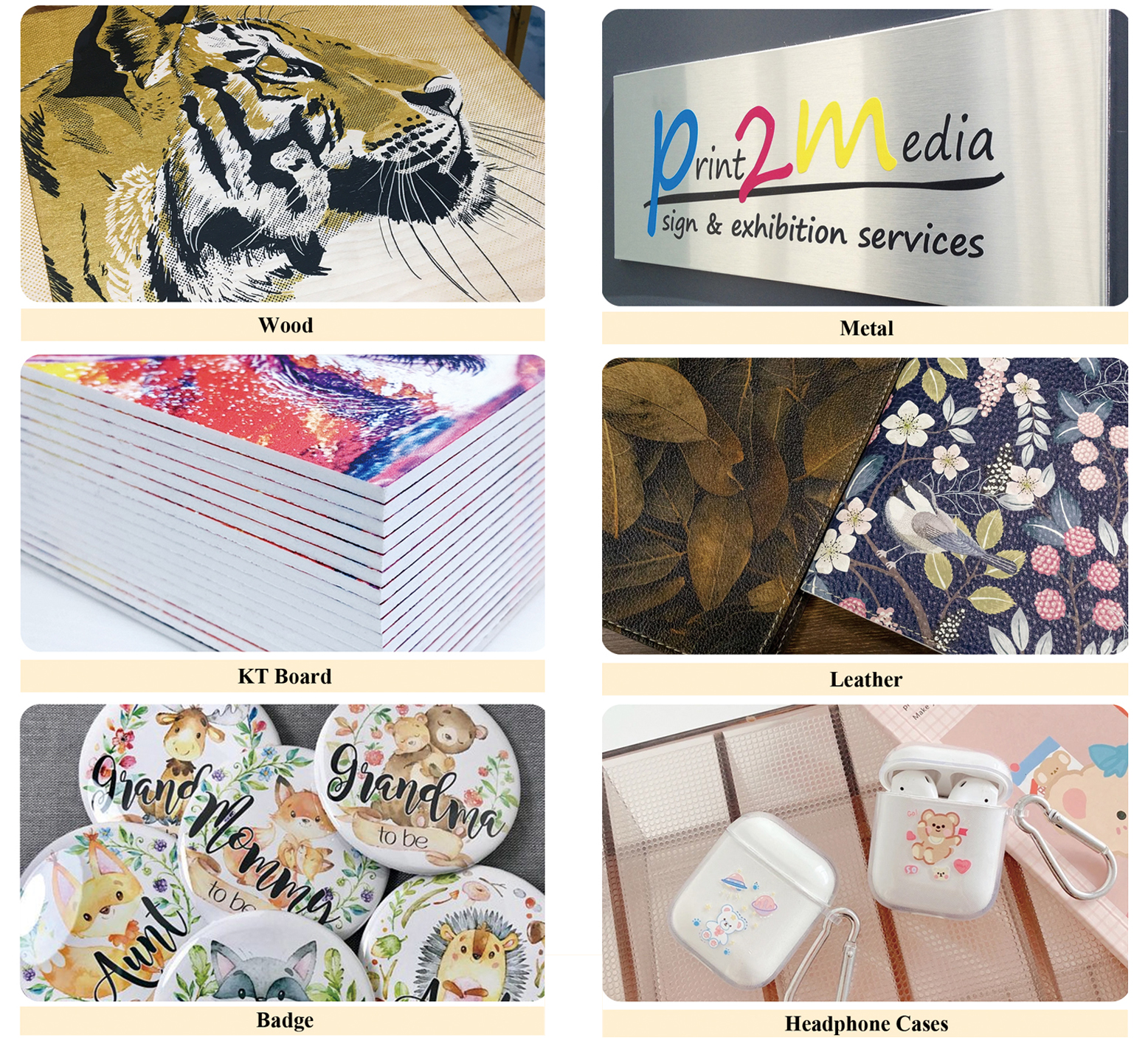 Prints on rigid substrates (wood, glass, acrylic, metal, ceramic, MDF, foam board, Correx, leather, etc.)