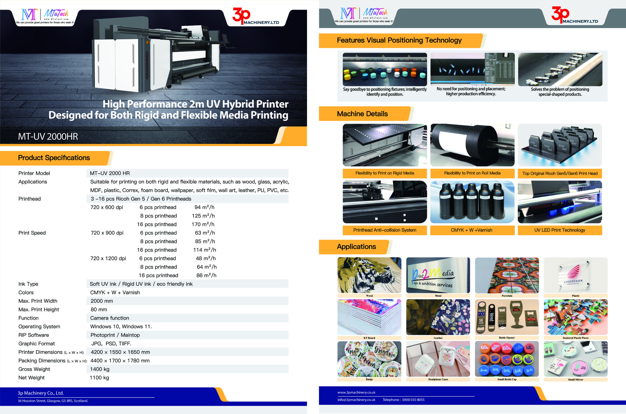 Ink System: Operates with MT’s eco-friendly UV LED-curable inks, available in both rigid and flexible formulations (CMYK + White + Varnish), incorporating “Thin Ink Layer” technology for vibrant colours and low ink consumption.
