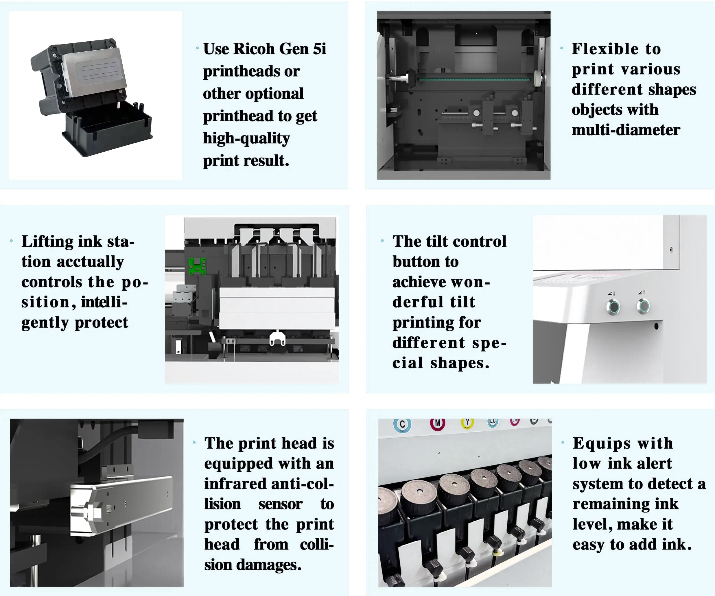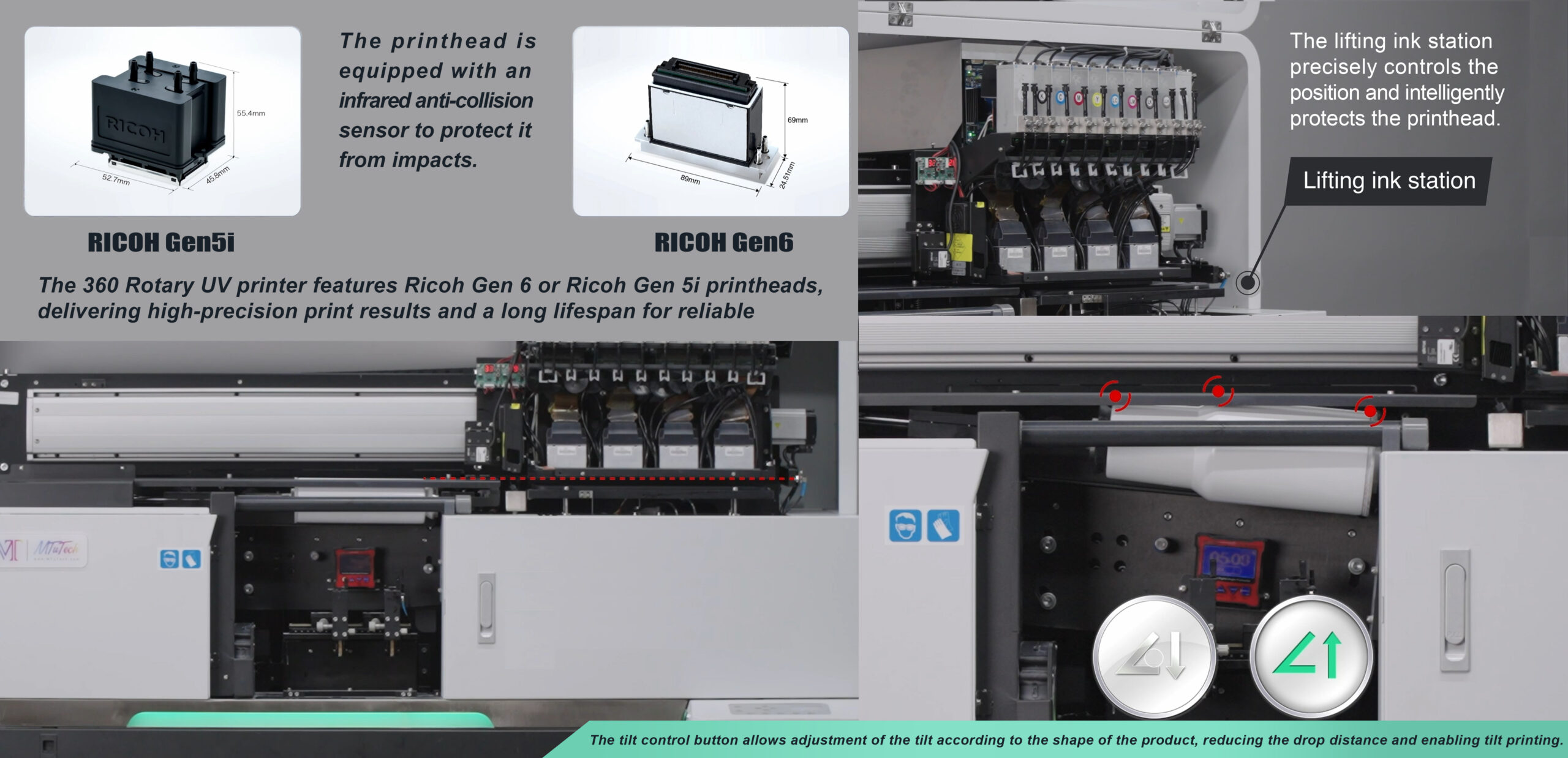 Industrial Ricoh Gen5i Printheads: Provides outstanding image clarity, high-resolution colour output, and long operational lifespan, supporting vibrant and complex artwork even at high speeds.