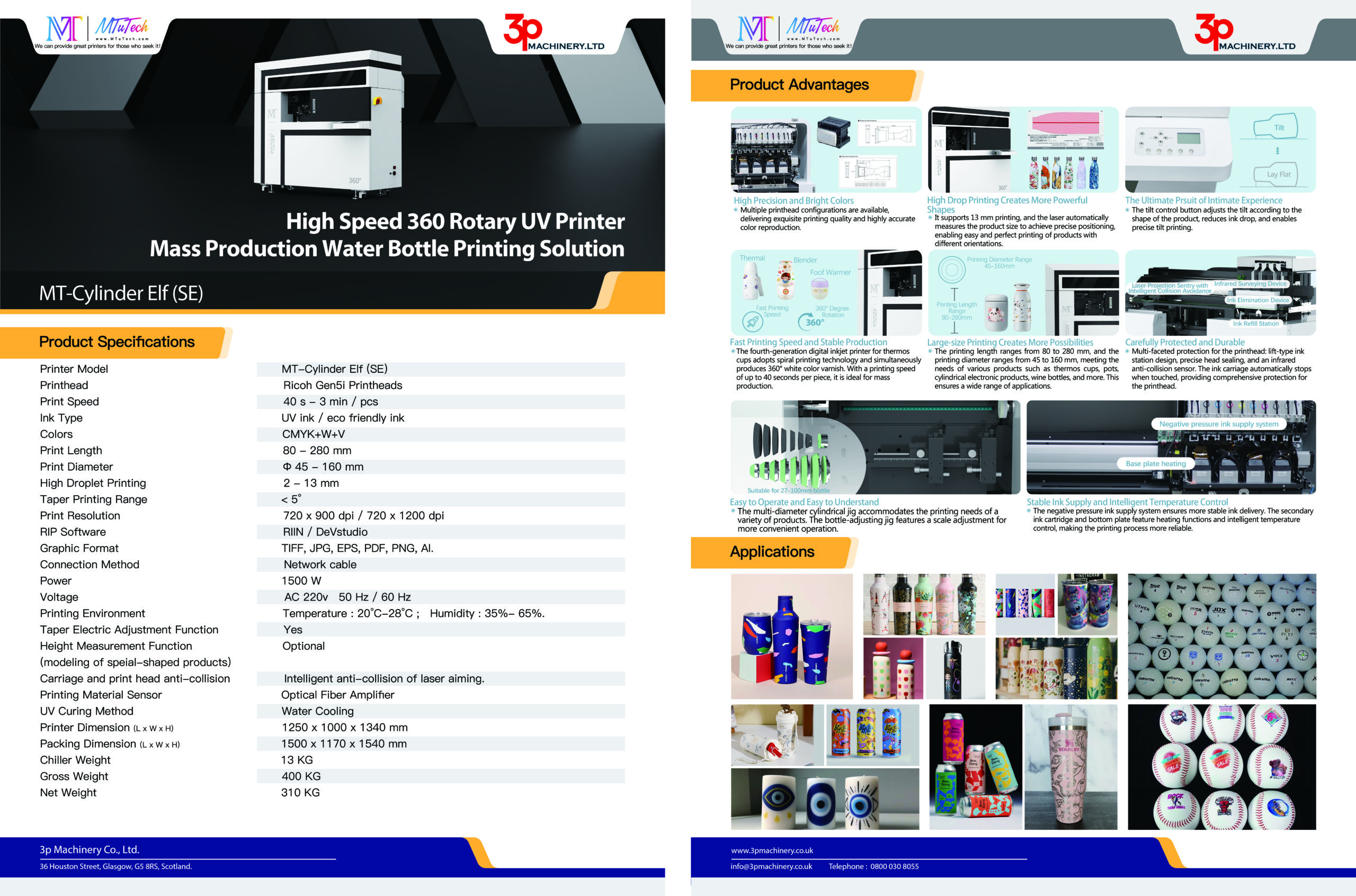 The MTuTech 360 Cylinder Elf is an advanced rotary UV digital printer engineered specifically for high-speed, full-wrap printing directly on cylindrical, tapered, and conical objects. Designed for industrial-scale customisation and mass production, this machine is ideally suited for items such as tumblers, water bottles, flasks, candles, golf balls, cans, and a diverse array of promotional gifts.