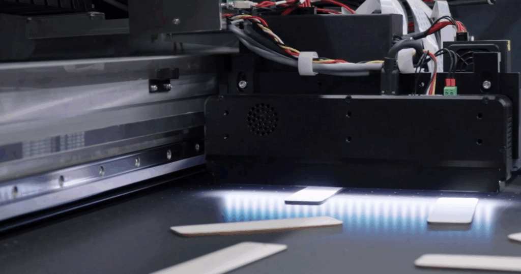 Two air-cooled UV LED lamps provide precise and consistent curing, enabling exceptional adhesion without stickiness or flaking. This curing system enhances the print’s resistance to wear and fading, making it ideal for both indoor and outdoor applications. Thanks to the printer’s ability to combine colour, white, and varnish layers seamlessly in one pass, you can produce eye-catching textured finishes with remarkable detail and clarity.