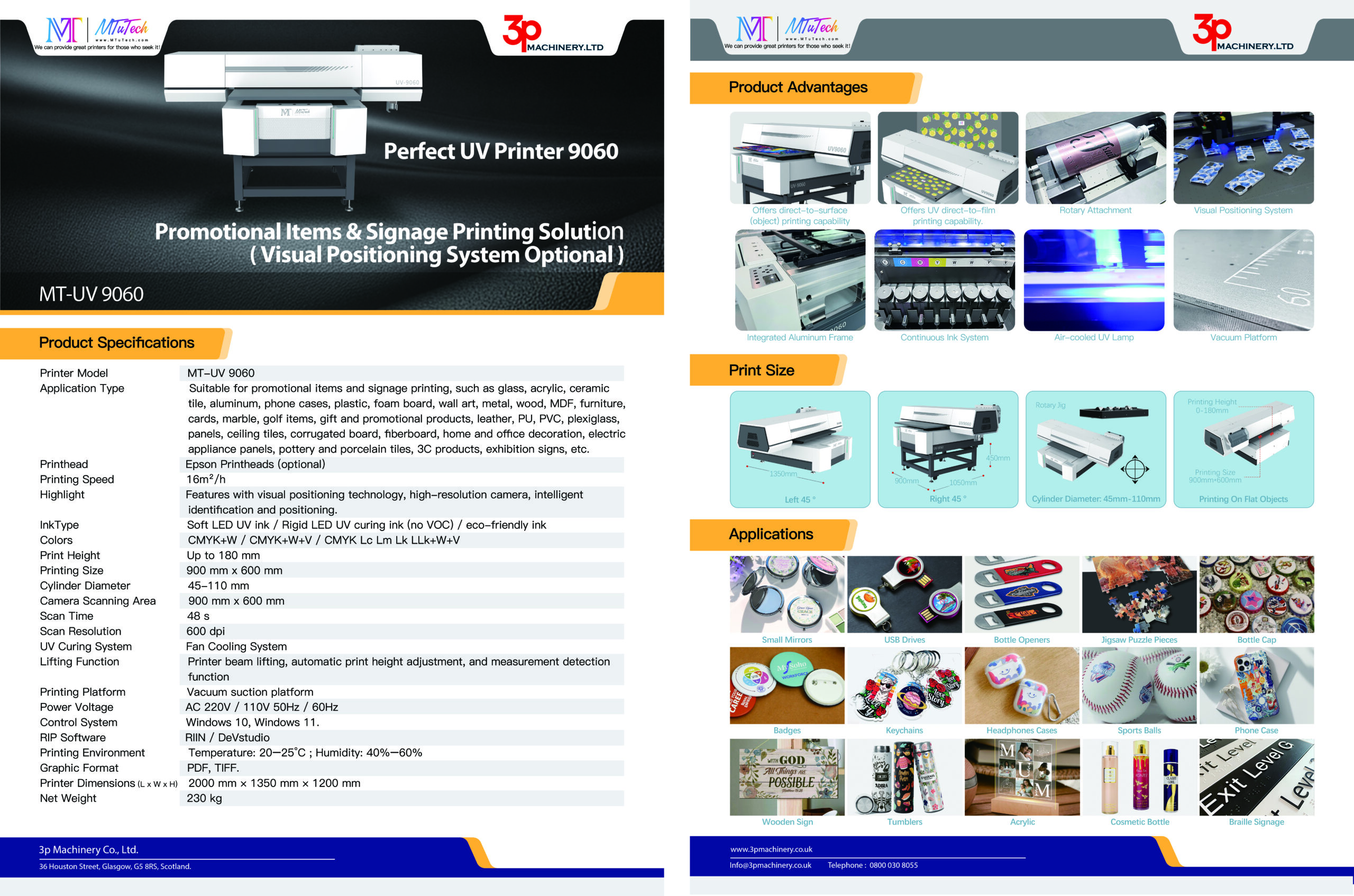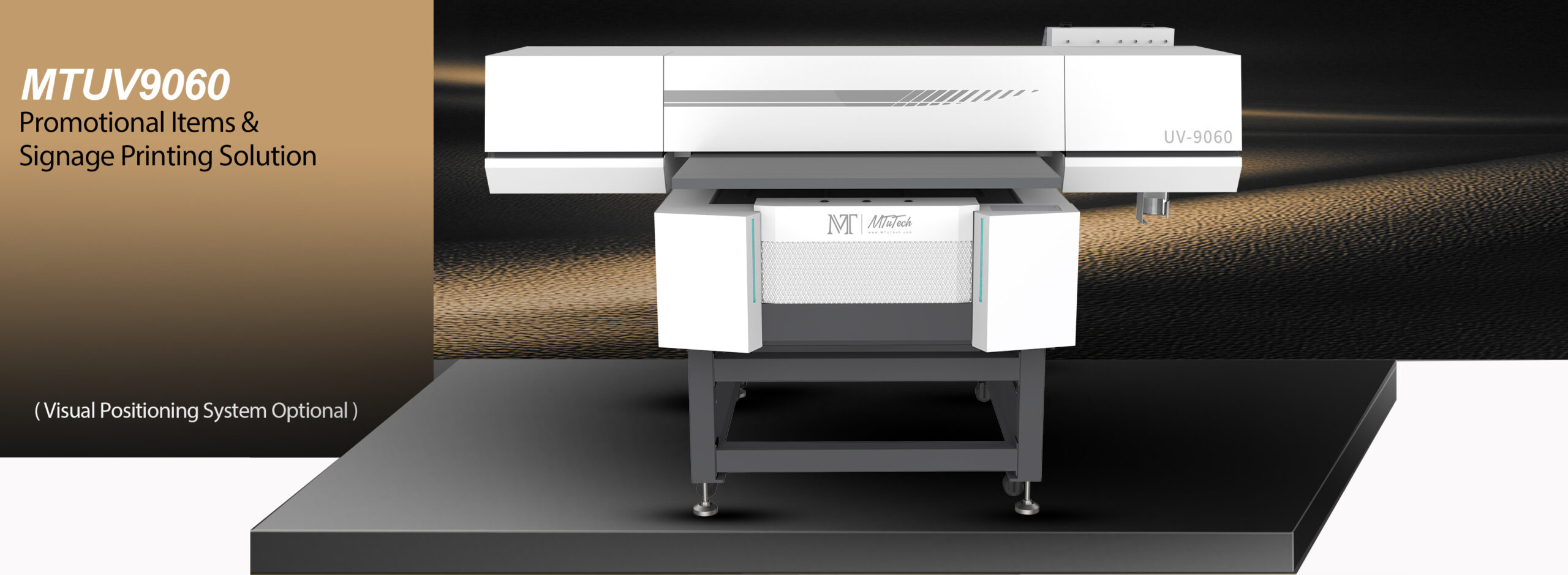Explore the MT-UV9060, a compact yet powerful UV flatbed printer designed to deliver high-quality printing across a wide range of materials and applications. Built for precision and reliability, this printer offers a versatile solution for professional printing needs. Its robust aluminium frame and advanced UV LED curing technology ensure vibrant, durable prints with exceptional colour accuracy and sharp detail. The MT-UV9060 is not limited to flat surfaces; it also enables printing on cylindrical objects, making it perfect for personalised promotional items. Beyond being a UV direct printer, it doubles as a UV DTF printer, expanding creative possibilities further. Its user-friendly design and versatile printing capabilities make it ideal for start-ups, medium-sized businesses, and large-volume print shops alike, empowering them to produce unique, customised products efficiently within a compact footprint.