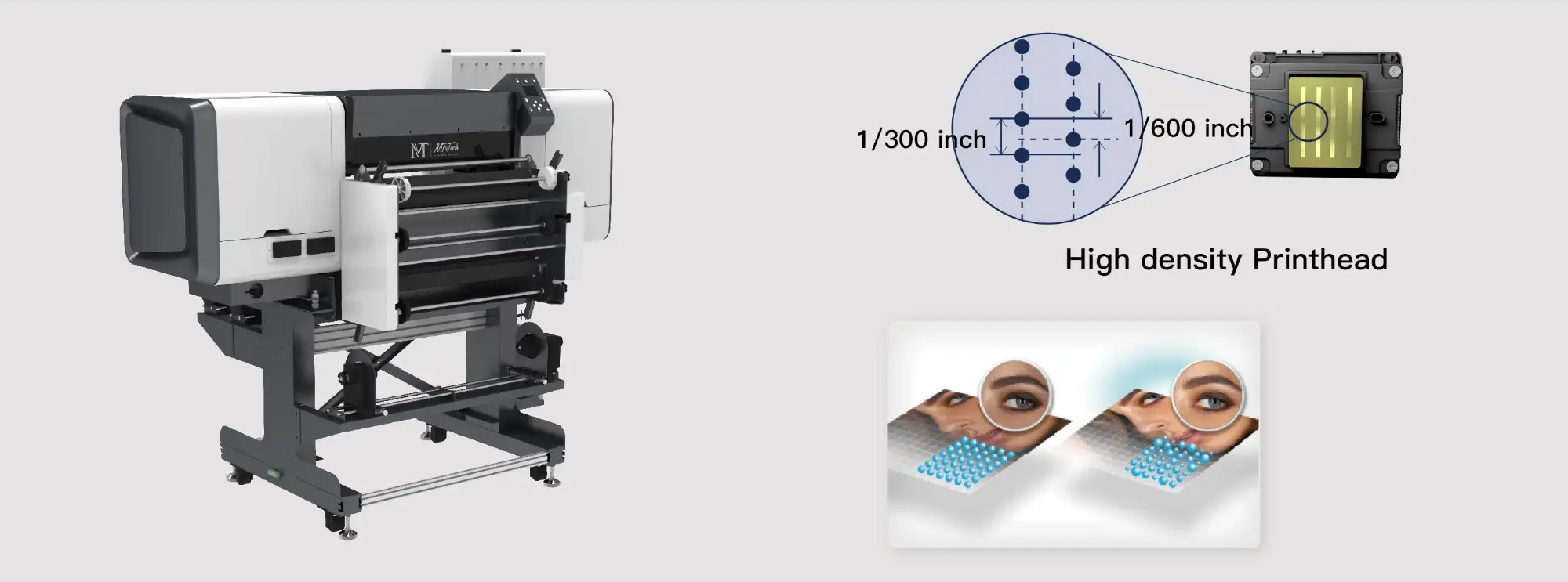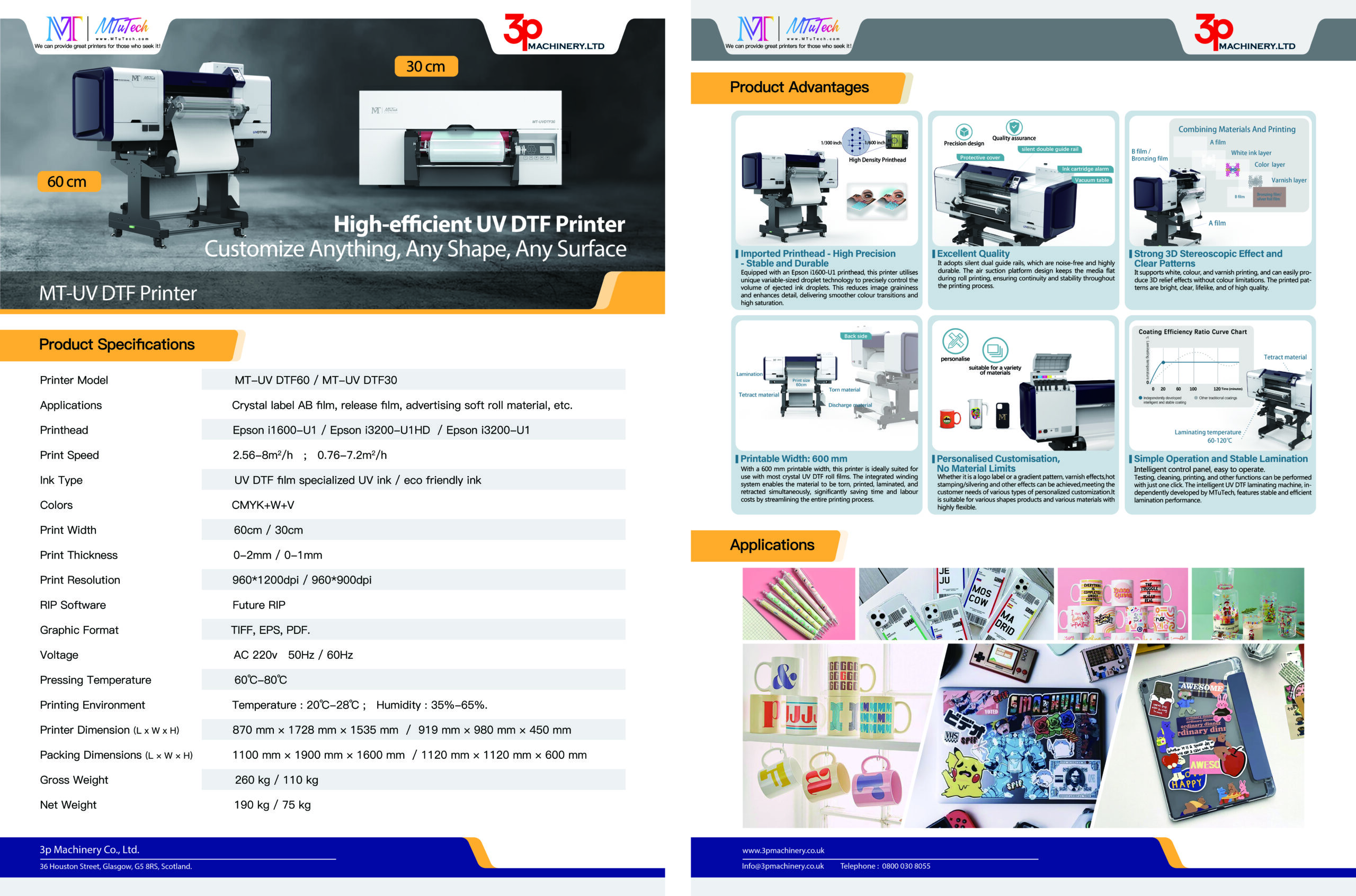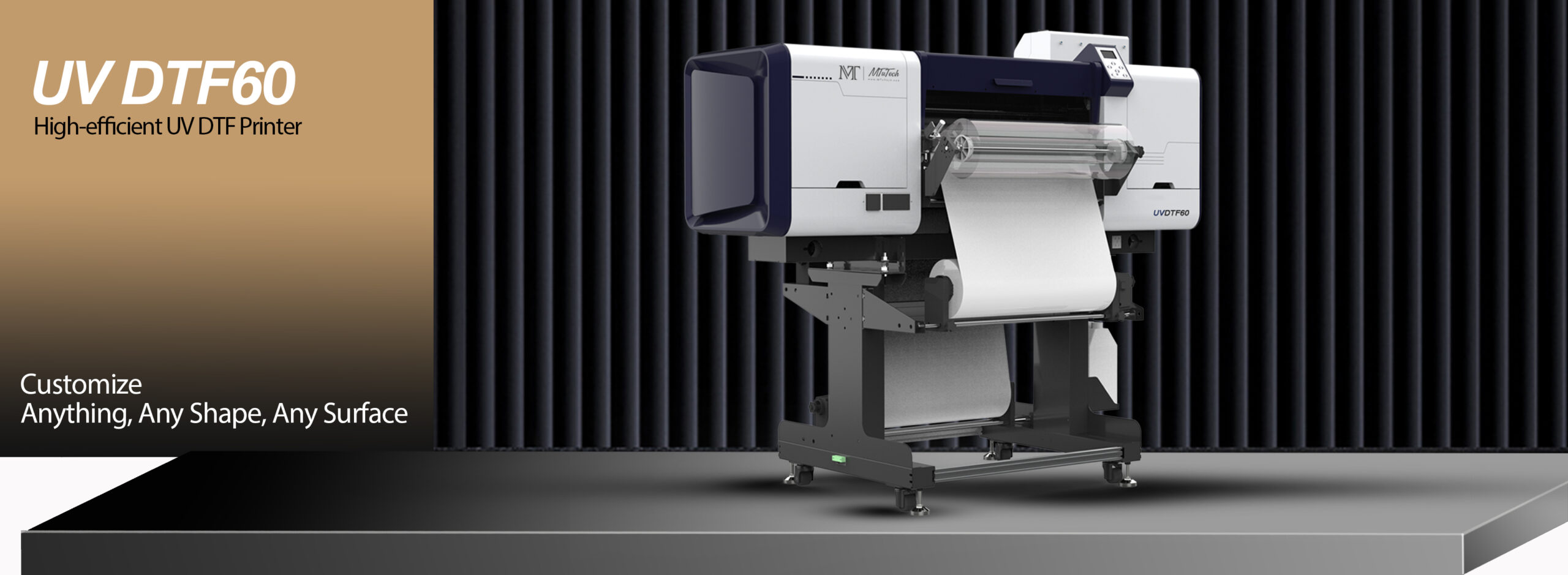 MTuTech UV DTF60 printer — a cutting-edge 60cm wide UV Direct-to-Film printing solution designed for vibrant, durable, and versatile custom printing. Equipped with advanced Epson I1600-U1 printheads using variable droplet technology, the UV DTF60 produces smooth, highly saturated prints with precise colour transitions and exceptional detail on a variety of flat or irregular surfaces.