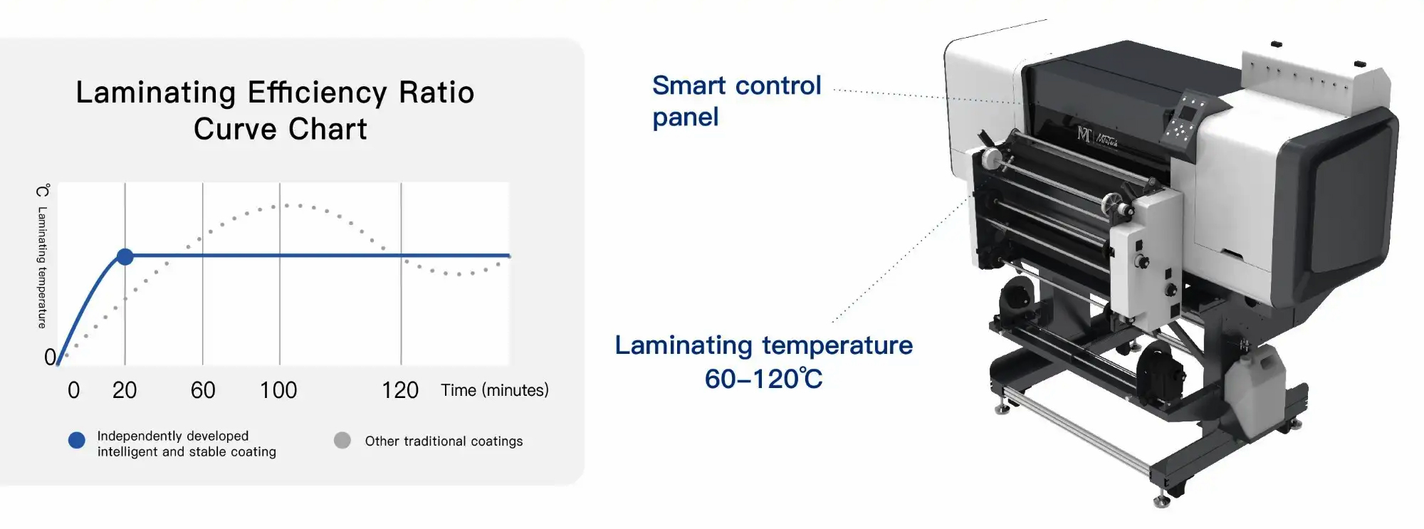 Operate effortlessly with the intelligent control panel. Handle testing, cleaning, and printing with a single click. Experience consistently stable and efficient film application with this smart UV DTF laminating machine.