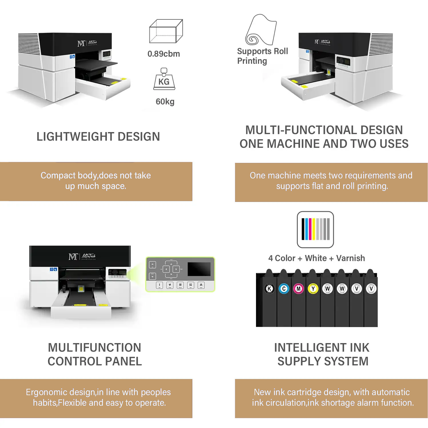 The MT-UVA3Pro’s rotary function lets users print full-colour, wraparound graphics on cylindrical items like bottles and mugs, using a rotary device for seamless and durable results. It’s easy to switch between flat and rotary printing and fits various item sizes for versatile, professional product decoration.